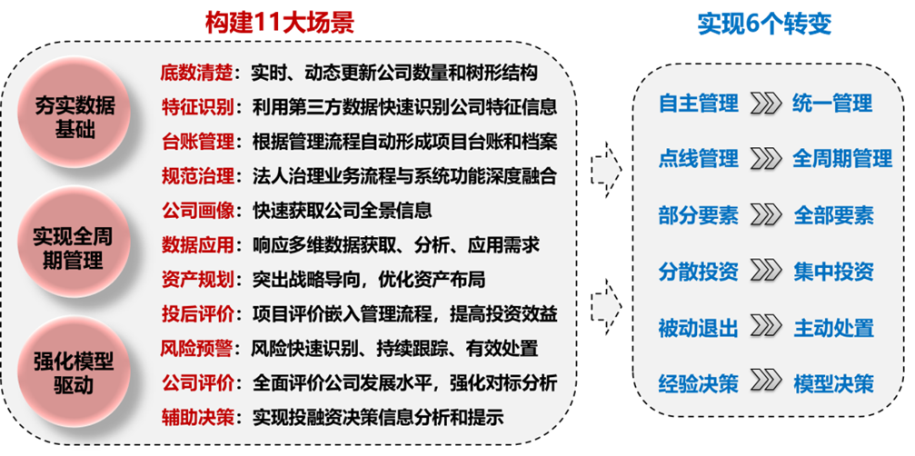 系統構建了11大應用場景,實現6個轉變,幫助集團用戶做到夯實數據基礎、實現全周期管理和模型驅動科學決策的目標。